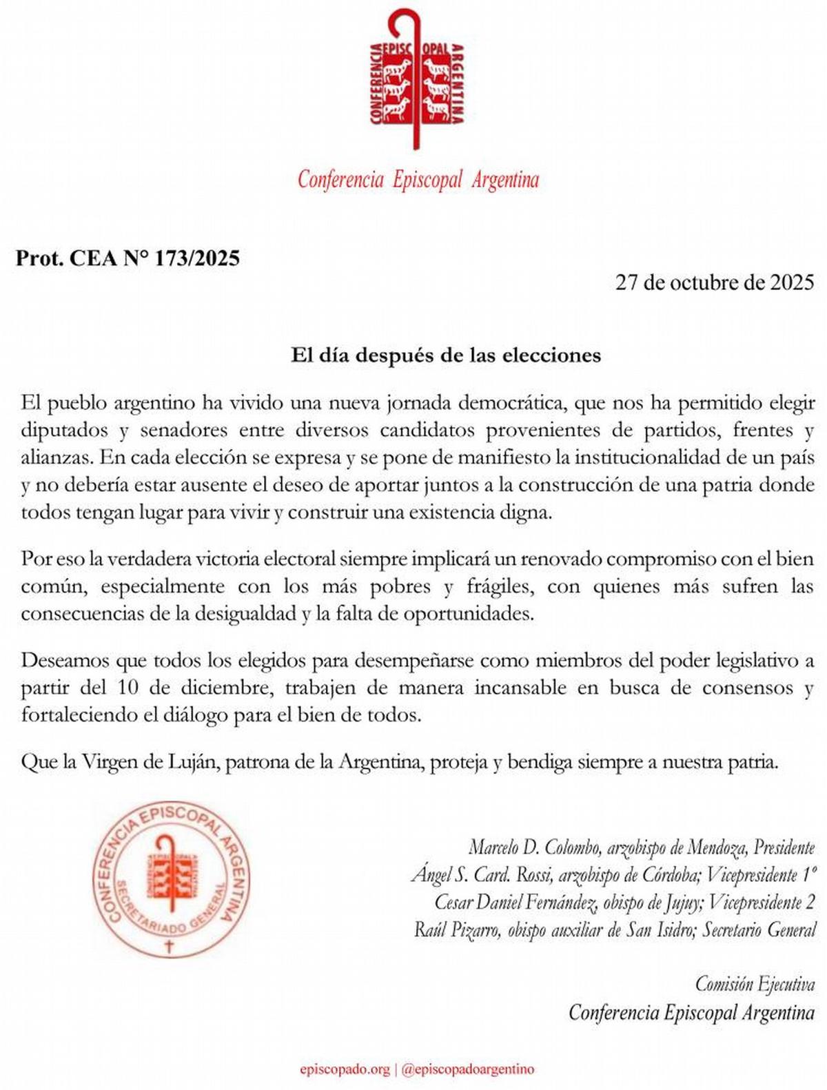 El mensaje concluye con una invocación a la Virgen de Luján, patrona de la Argentina, para que "proteja y bendiga siempre a nuestra patria". El texto lleva las firmas de monseñor Marcelo Colombo, arzobispo de Mendoza y presidente de la CEA; el cardenal Ángel Rossi SJ, arzobispo de Córdoba y vicepresidente primero; monseñor Daniel Fernández, obispo de Jujuy y vicepresidente segundo; y monseñor Raúl Pizarro, obispo auxiliar de San Isidro y secretario general.