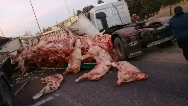 El episodio, que ocurrió este jueves a la mañana, dejó esparcido sobre el camino las piezas de carne que la gente aprovechó para llevarse, previo consentimiento del chofer que consultó primero a los dueños de la empresa.