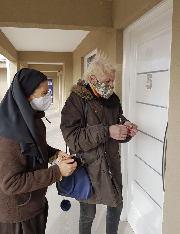 Como parte del acto, la religiosa acompañó a cada una a abrir por primera vez la puerta de su nueva casa.