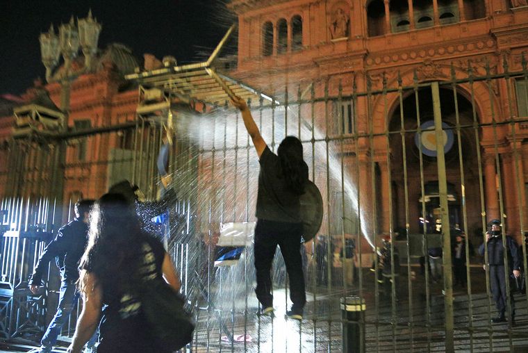 En tanto, en la Plaza de Mayo también se registraron momentos de tensión cuando un grupo reducido de personas se trepó a la reja de la Casa de Gobierno y intentó arrojar una valla metálica por encima de esa protección, ante lo cual bomberos arrojaron agua en un intento por dispersarlo.