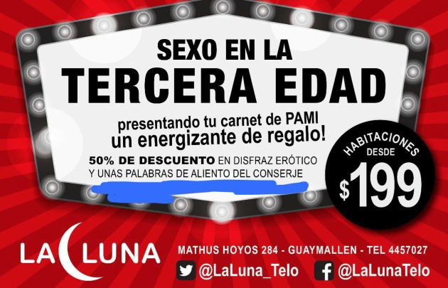 Se trata del motel Luna, uno de los más antiguos de la ciudad capital, que por treses meses ofrece un 50% de descuento en el alquiler de disfraces eróticos y un energizante de regalo para aquellos jubilados que concurran al establecimiento y presenten el carnet actualizado del PAMI.