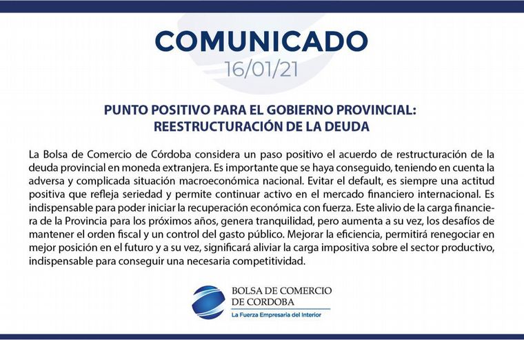 En un comunicado oficial, la entidad cordobesa destacó como "positivo" la reestructuración y la negociación con los acreedores, anunciado por el gobernador Juan Schiaretti la semana pasada. Mirá.