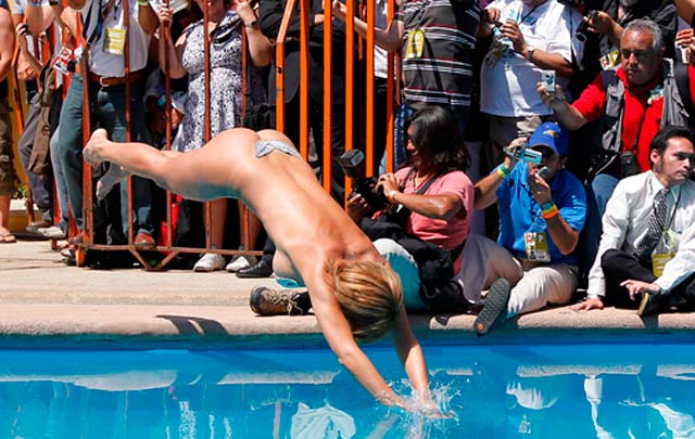 Con un atuendo que no alcanza a llamarse bikini, la bella representante de Alfombra Roja se lanzó dos clavados en la piscina del Hotel O’Higgins ante la expectación de la prensa acreditada.