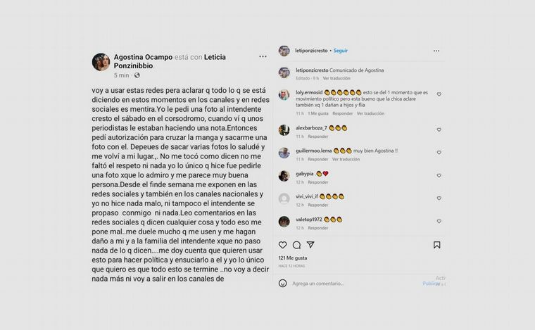 Por su parte, la esposa del intendente, Leticia Ponzinibbio, compartió en su cuenta de Instagram la publicación de Agostina.