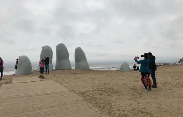 El gigantesco monumento de La Mano se asoma en las arenas blancas en la Parada 4 de la Playa Brava en la Península de Punta del Este.