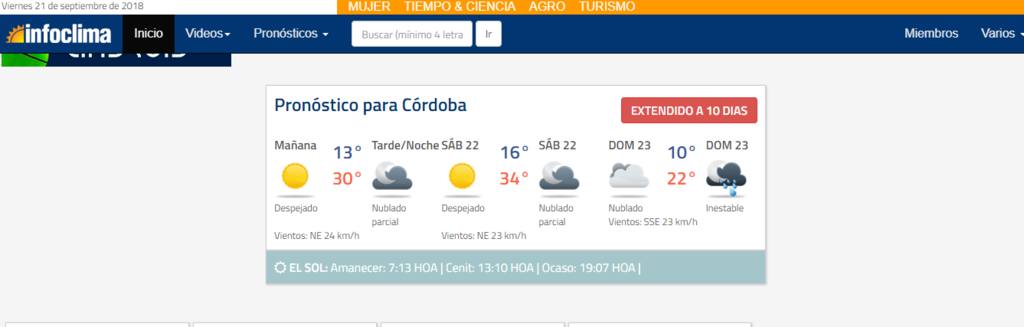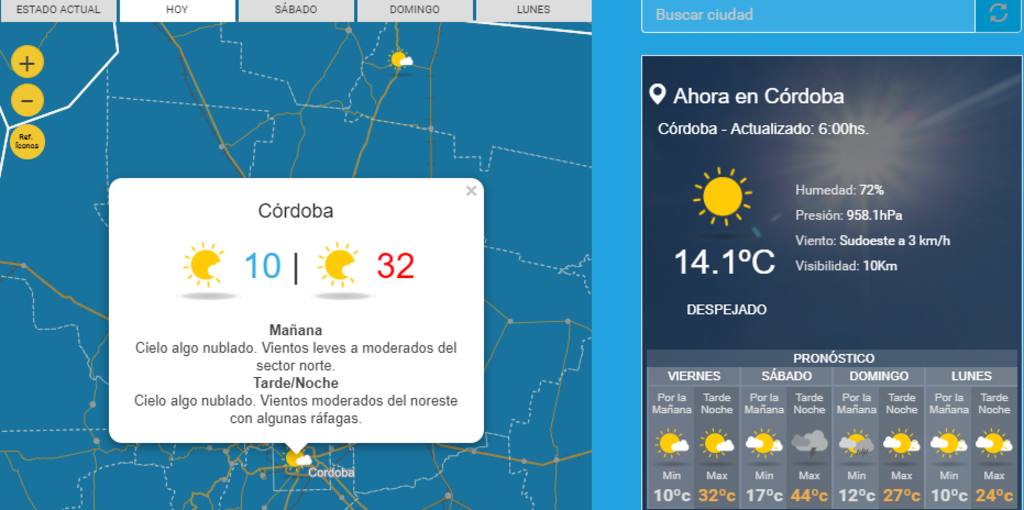 Para Córdoba pronostica cielo algo nublado con vientos leves a moderados del sector norte para la mañana de este viernes con temperaturas en ascenso para lo que resta de la jornada, con una máxima estimada en 32 grados.