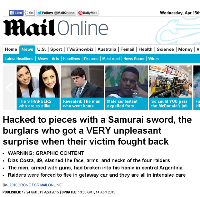 El asalto que un vecino repelió con una katana en barrio Cerro Norte y que anticipara Cadena 3 llegó a la portada del Daily Mail. Mirá y comentá.
