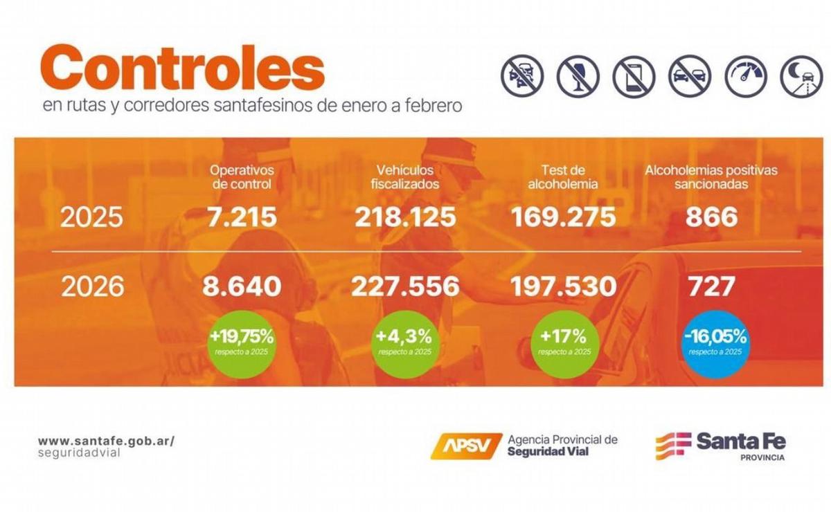 En el primer trimestre de 2026 se hicieron 197.530 controles en rutas santafesinas, un 17 % más que en 2025. Detectaron 727 casos positivos sancionables en el marco de más de 8.600 operativos de la APSV.