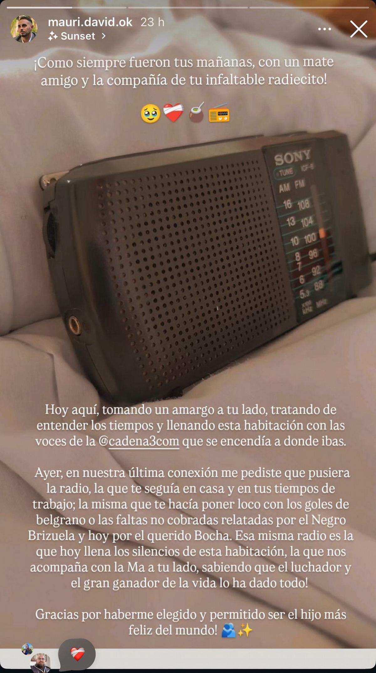 El relato se centró en los últimos momentos de su vida, donde, a pesar del dolor, la conexión con la radio se mantuvo. "Mi viejo dentro de su situación, ya en cama, con morfina, con oxígeno, no podía hablar. Y cuando conectaba, que era muy rara vez, sí o no con la cabeza", explicó Mauricio.