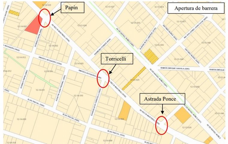 Cordón separador de sentidos de circulación: se requiere la ejecución de una barrera de separación de sentidos de circulación, con tipología similar a la ejecutada en la avenida Ricardo Rojas (altura 15 cm y ancho 30 cm). La barrera deberá interrumpirse en las intersecciones de la avenida Recta Martinoli con las calles Astrada Ponce, Evangelista Torricelli y Dionisio Papín, de manera de permitir la incorporación vehicular a la mencionada avenida y el cruce de la misma.