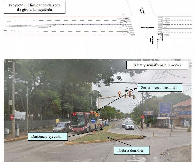 Modificación e isleta en intersección con avenida Carlos Gauss: en la intersección de las avenidas Recta Martinoli y Carlos Gauss, se deberá demoler la isleta existente y ejecutar una dársena de giro a la izquierda de no menos de 50 metros de longitud. Al igual que en el caso anterior, se deberá prever la instalación de las cañerías para el cableado de los semáforos que regulan la intersección.