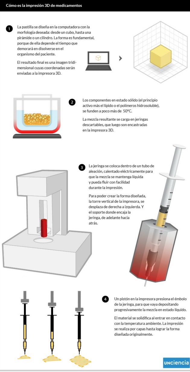 "La impresora tiene un cabezal donde va el material fundido que contiene el medicamento. A través de un sistema de modelo 3D se pasa de computadora a impresora y se imprime un comprimido", precisó el médico.
