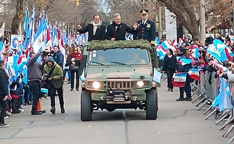 Junto al intendente Juan Manuel Llamosas, encabeza el desfile sobre avenida San Martín 1300, en la esquina con la calle Ingeniero Dinkeldein.