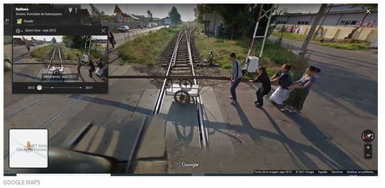 El tiktoker compartió las imágenes captadas Street View en la ciudad polaca de Krosno, de 50 mil habitantes, justo en uno de los pasos a nivel de la localidad.