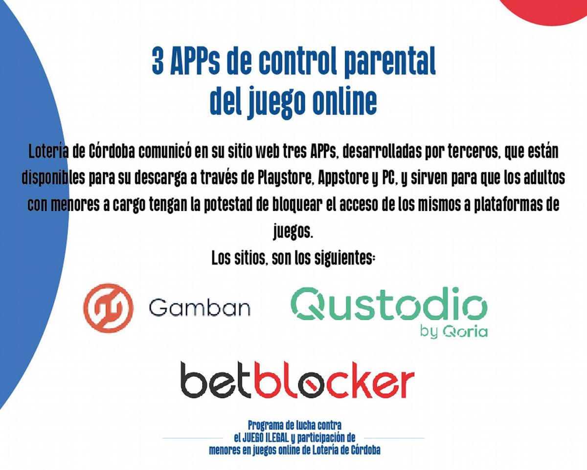 La Lotería de Córdoba anunció que desde su sitio web (loteríadecordoba.com.ar) se puede acceder a tres aplicaciones de bloqueo y control parental para que los adultos con menores a su cargo puedan bloquear el acceso a plataformas de juego, entre otras opciones.