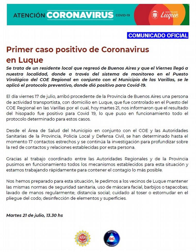 De acuerdo al comunicado oficial, se trata de una persona que regresó de Buenos Aires y tras hacerse el hisopado se determinó que era positivo de Covid-19.