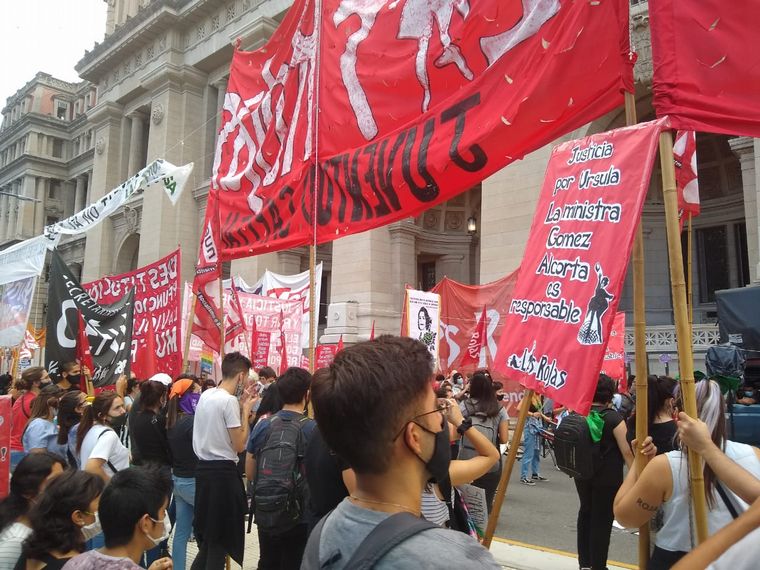 "Estamos cansadas de que nos maten todos los días", dijo Laura Granillo, del colectivo Las Rojas, mientras sostenía un cartel donde se leía "Ni una menos. Justicia por Úrsula" y marchaba hasta el edificio de los tribunales platenses, en las calles 7 y 58.