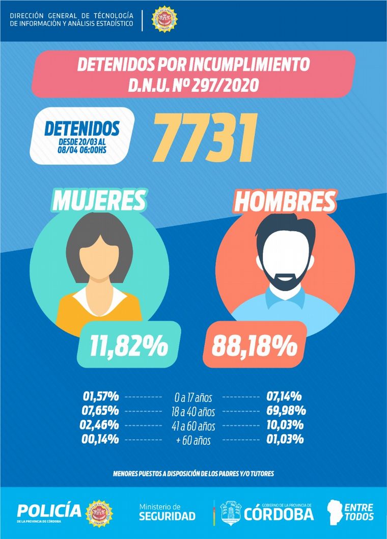 El Ministerio de Seguridad difundió un documento que precisa los casos en cada departamento de la provincia. La mayoría de los 7.500 detenidos desde el 20 de marzo son hombres.