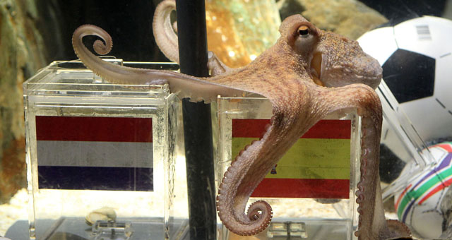 Al archiconocido pulpo se le ofrecían dos tachos llenos de comida, uno con la bandera de cada país jugador. El animal pensaba unos segundos para abrazarse después a uno de los tachos.