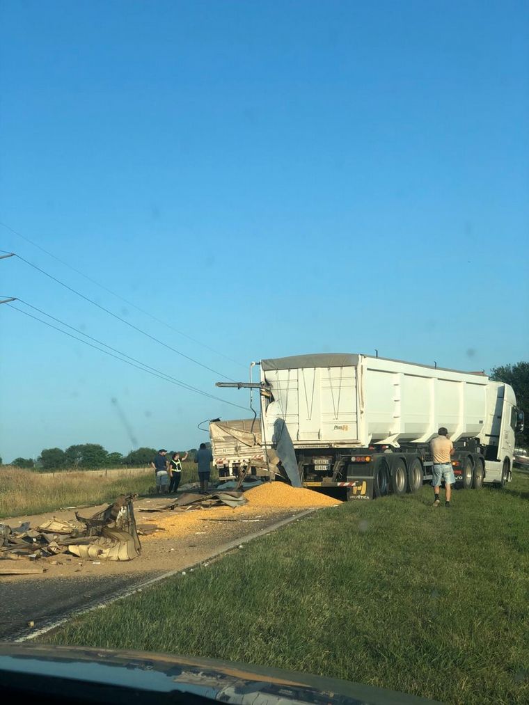 Uno de los vehículos de mayor porte volcó y quedó atravesado sobre la carpeta asfáltica, mientras que el otro desparramó su carga de cereal en la zona.