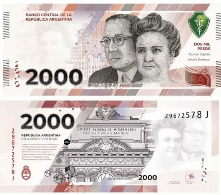 Este lunes comenzó la circulación del nuevo billete de $ 2.000. El papel moneda tiene la imagen del Instituto Malbrán, de la doctora Cecilia Grierson y el doctor Ramón Carrillo, referentes de la historia de la medicina en el país.
