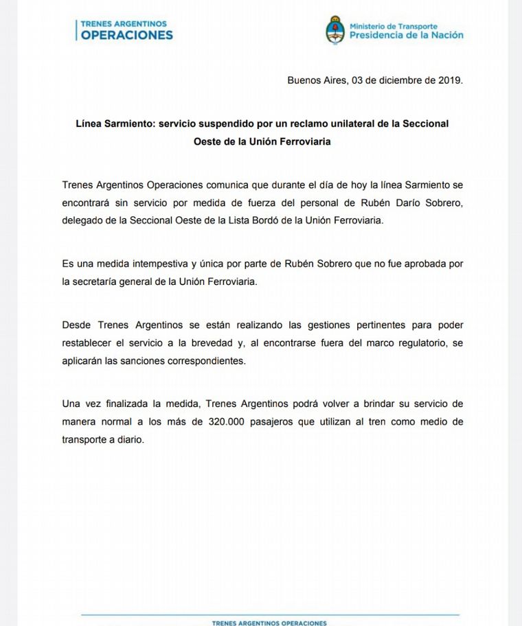 A partir de esta medianoche y por 24hs cese de actividades de la especialidad Guarda trenes del Sarmiento! pic.twitter.com/s2zfu2JgBM