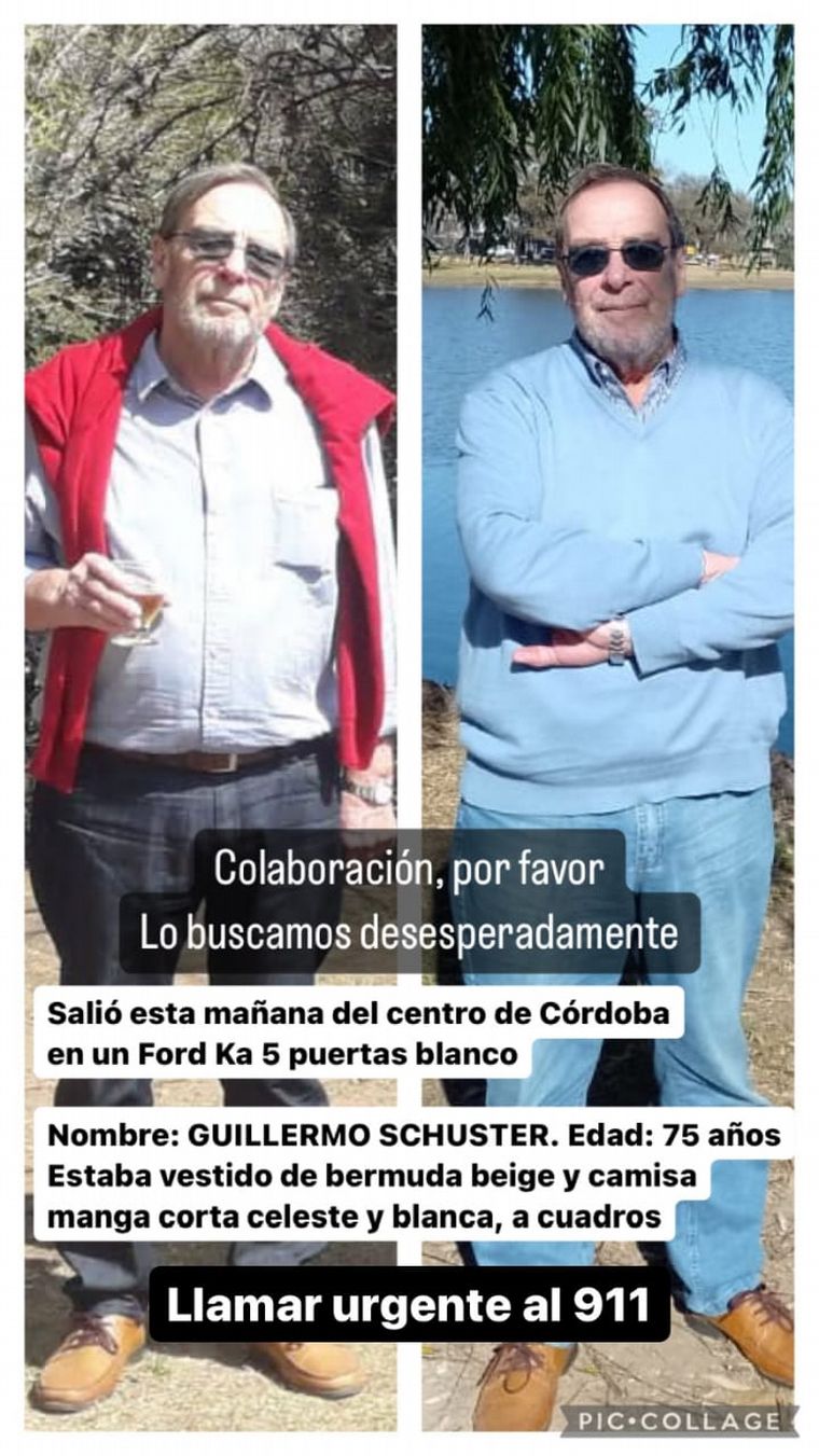 Se llama Guillermo Schuster. Lo vieron por última vez este martes a la mañana, cuando se fue al centro de la ciudad en su automóvil Ford Ka blanco.