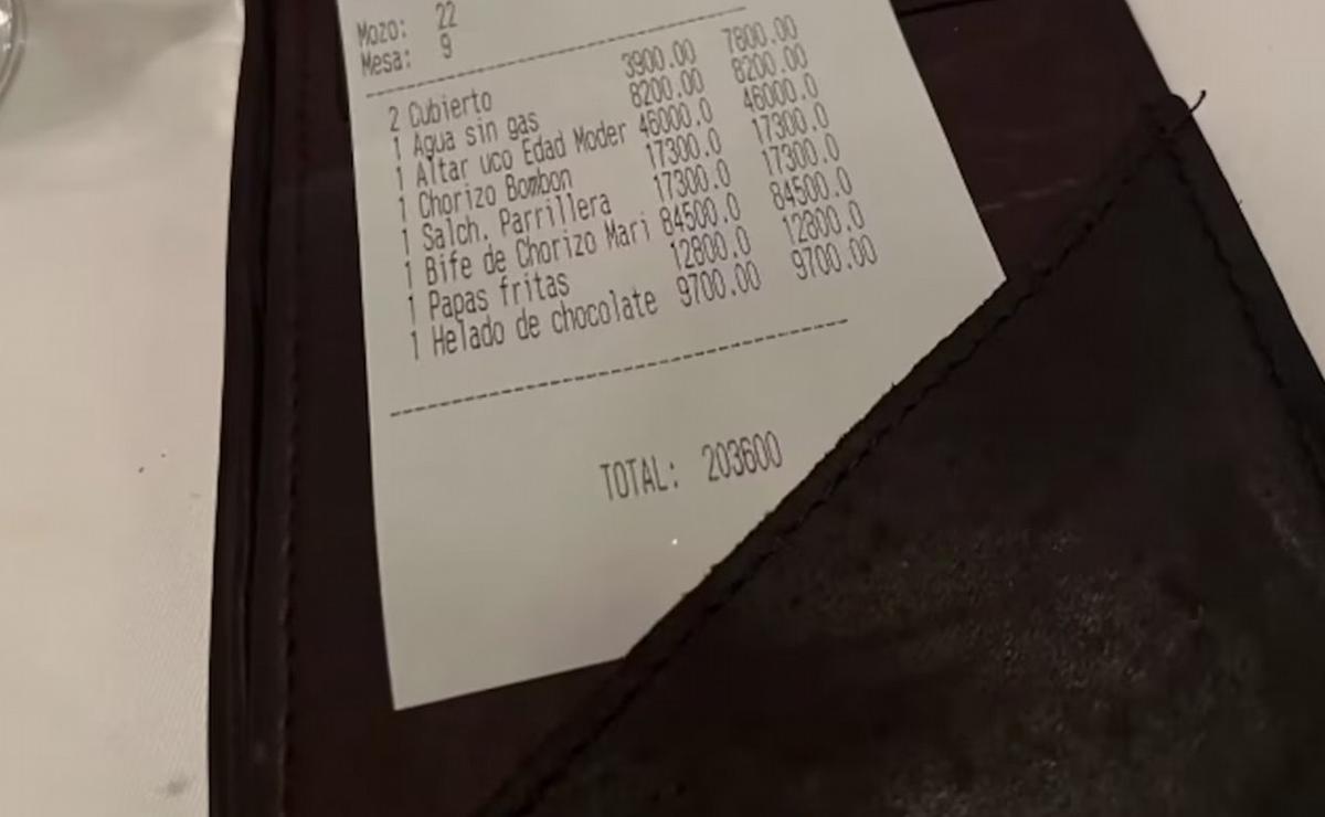 El ticket incluyó dos cubiertos por un total de $7.800, es decir, $3.900 por persona. La bebida consistió en agua con gas que costó $6.500 y una botella de Malbec Edad Moder cuyo valor fue de $46.000. Para la entrada, solicitaron un chorizo bombón a $17.300 y una salchicha parrillera por el mismo monto. El plato principal constó de dos bifes de chorizo que sumaron $84.500 en total. Para acompañar, eligieron papas fritas a $12.800 y para cerrar la comida, un helado de chocolate a $9.700. La suma total de la cuenta arrojó $203.600.