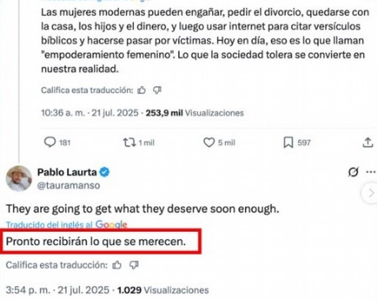 Laurta, un uruguayo radicado en Argentina que se presentaba como "empresario de medios digitales", utilizaba plataformas como X (antes Twitter) para publicar mensajes contra el feminismo y relativizar la violencia contra las mujeres. Uno de sus posteos más escalofriantes, que ahora adquiere un tono siniestro a la luz de los hechos, rezaba: "Pronto recibirán lo que se merecen".
