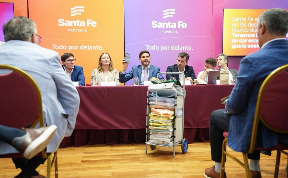 En el cierre -tras casi dos horas de encuentro-, Pullaro acompañó el mensaje con una anécdota que sintetizó el cambio de paradigma: mostró el viejo carro en el que se trasladaban expedientes hasta 2023 y levantó su teléfono celular para compararlo. “Hoy eso lo reemplazamos por esto”, dijo ante el auditorio.