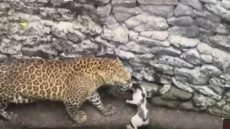 En el video se observa al leopardo cargando contra el gato, mientras que éste reacciona parándose en sus dos patas traseras en un gesto intimidante para defenderse.