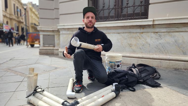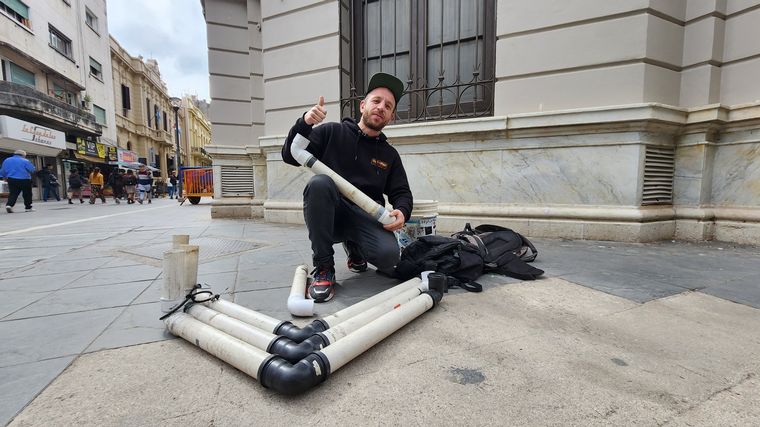 En distintos lugares de la peatonal y los fines de semana en la plaza seca de Güemes ofrece un espectáculo callejero que es furor entre el público: toca música electrónica con caños de PVC.