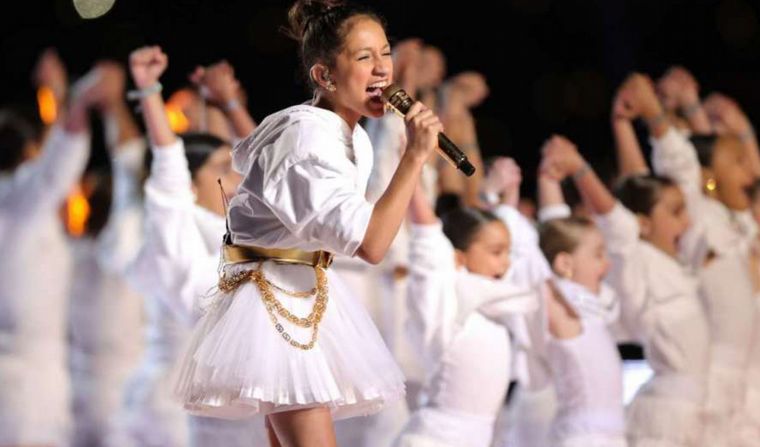 La pequeña de 11 años lideró el coro de niños vestidos de blanco que participó del espectáculo que tuvo lugar en el medio tiempo del partido entre los entre los Kansas City Chiefs y los San Francisco 49ers.