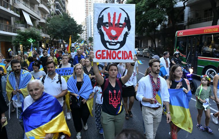 La nutrida movilización a la embajada de Rusia concentró primero en el cruce de las avenidas Santa Fe y Callao, en el barrio porteño de Recoleta, para finalizar en la sede de las calles Rodríguez Peña y Guido, y contó con muchas banderas azules y amarillas del país invadido por el Kremlin.