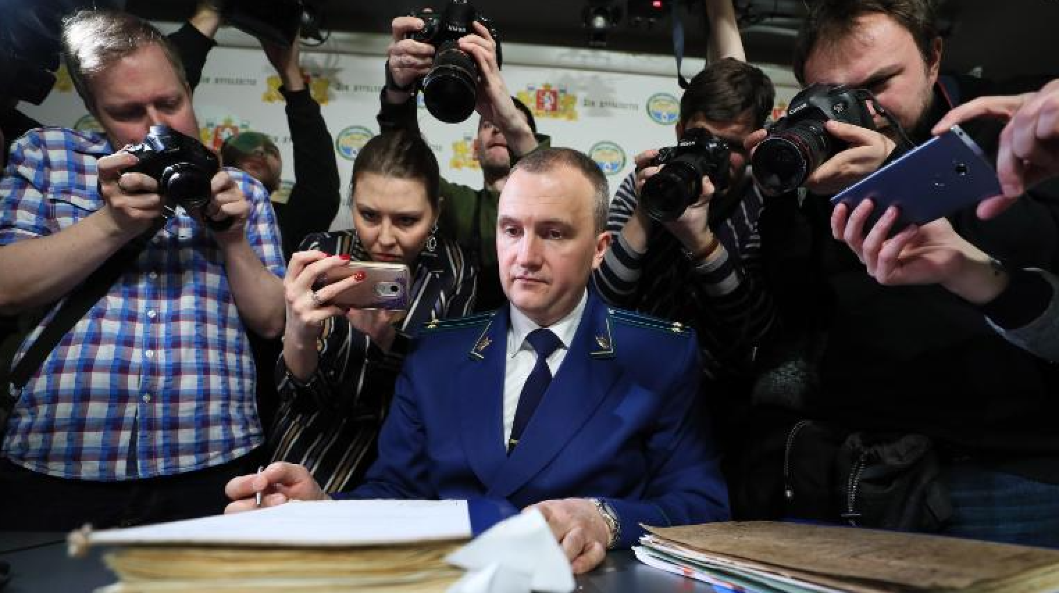 Andréi Kuriákov y periodistas durante una conferencia de prensa sobre la reapertura de la investigación