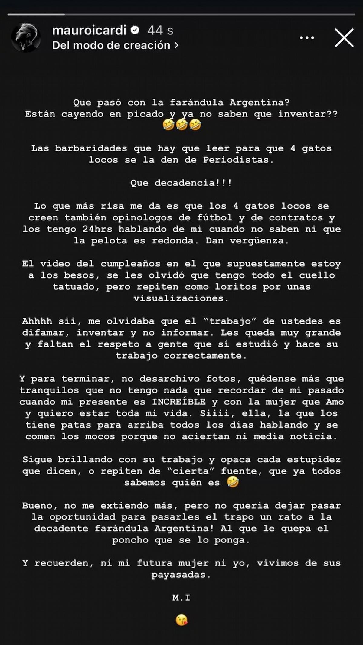Frente a la polémica, Icardi utilizó sus redes sociales para negar cualquier maniobra. “No desarchivé fotos, quédense más que tranquilos que no tengo nada que recordar de mi pasado cuando mi presente es increíble y con la mujer que amo y quiero estar toda mi vida”, escribió.