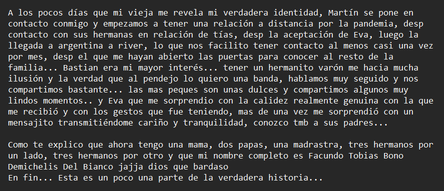 A los pocos días que mi vieja me revela mi verdadera identidad, Martín se pone en contacto conmigo y empezamos a tener una relación a distancia por la pandemia, desp contacto con sus hermanas en relación de tias, desp la aceptación de Eva, luego la llegada a argentina a River, lo que nos facilitó tener contacto al menos casi una vez por mes, desp el que me hayan abierto las puertas para conocer al resto de la familia... Bastian era mi mayor interés... tener un hermanito varón me hacía mucha ilusión y la verdad que al pendejo lo quiero una banda, hablamos muy seguido y nos compartimos bastante... las mas peques son unas dulces y compartimos algunos muy lindos momentos.. y Eva que me sorprendio con la calidez realmente genuina con la que me recibió y con los gestos que fue teniendo, más de una vez me sorprendió con un mensajito transmitiéndome cariño y tranquilidad, conozco tmb a sus padres.