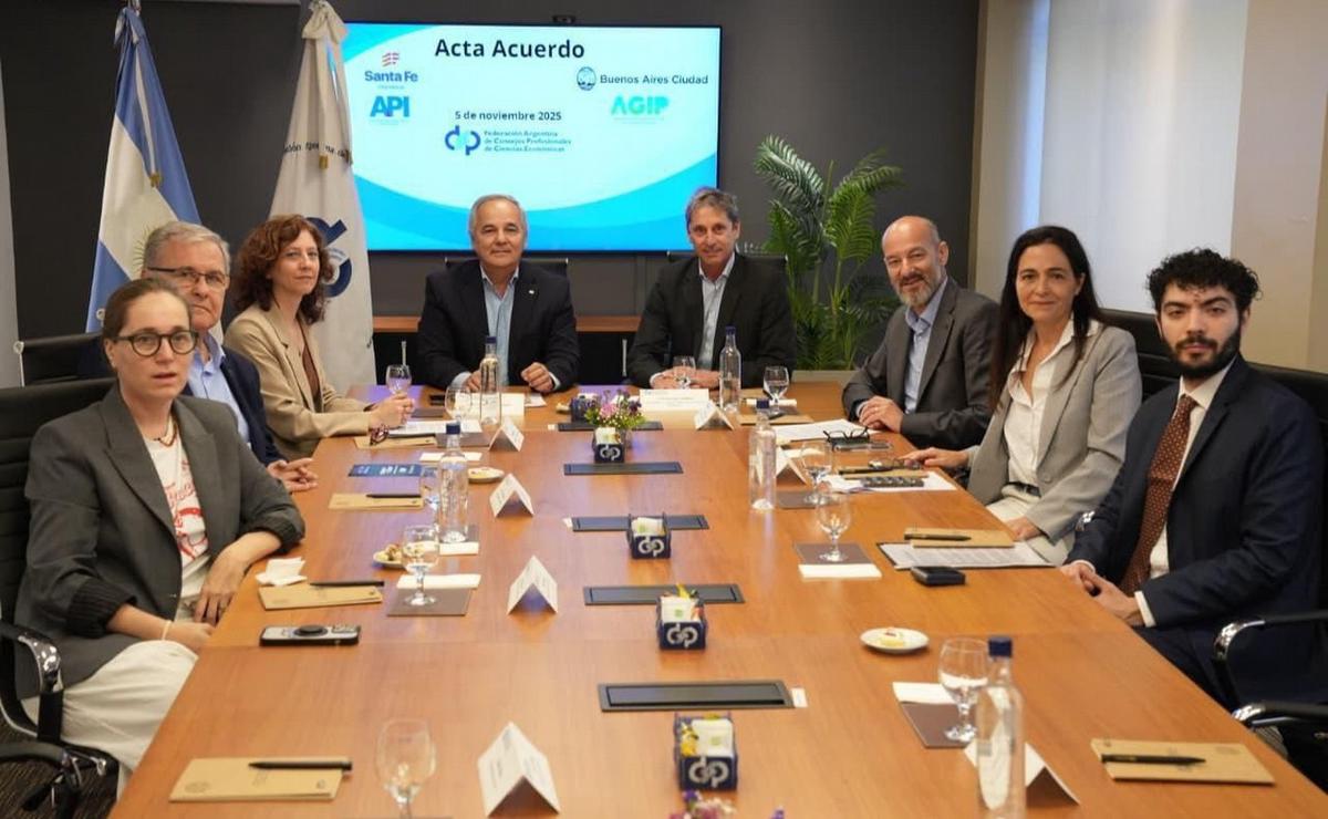La firma del convenio tuvo lugar en la sede de la Federación Argentina de Consejos Profesionales de Ciencias Económicas, en la Ciudad de Buenos Aires. Participaron el subsecretario de Ingresos Públicos de Santa Fe, Florencio Galíndez; Gerardo Rico, presidente del Consejo Profesional de Ciencias Económicas de Santa Fe; Soledad Amione y Cecilia Priego, de la AGIP; y Dionisio Mulone, del área de Relaciones Institucionales.