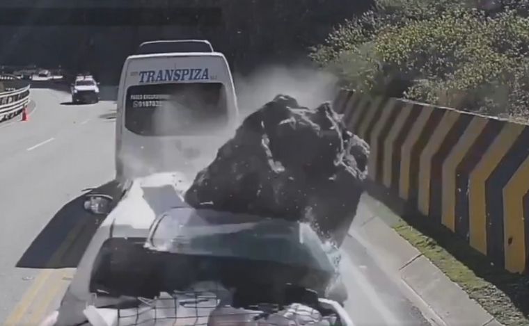 En ese momento, la roca se desprendió de la parte alta del cerro, impactando violentamente contra la camioneta.
