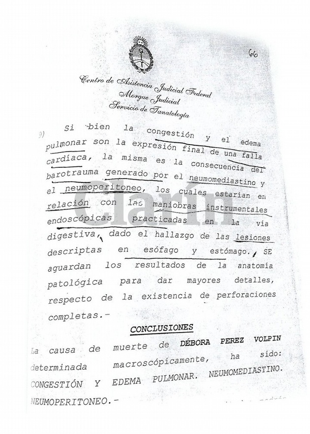 “Si bien la congestión y el edema pulmonar son la expresión final de una falla cardíaca, la misma es la consecuencia del barotrauma generado por el neumomediastino y el neumoperitoneo, los cuales estarían en relación con las maniobras instrumentales endoscópicas practicadas en la vía digestiva dado al hallazgo de las lesiones descriptas en esófago y estómago. Se aguardan resultados de la anatomía patológica para dar mayores detalles respecto de la existencia de perforaciones completas. Conclusión: la causa de la muerte determinada macroscópicamente ha sido congestión y edema pulmonar, neumomediastino y neumoperitoneo”, dice la pericia que publicó el medio gráfico.
