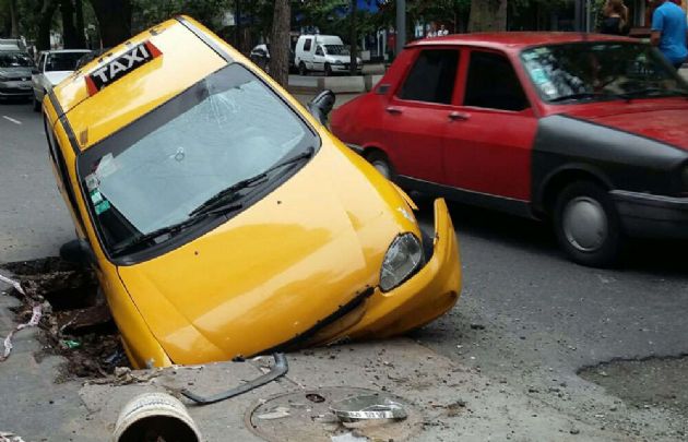 Un taxi fue literalmente tragado por un súper bache en plena avenida Chacabuco, en el barrio de Nueva Córdoba.