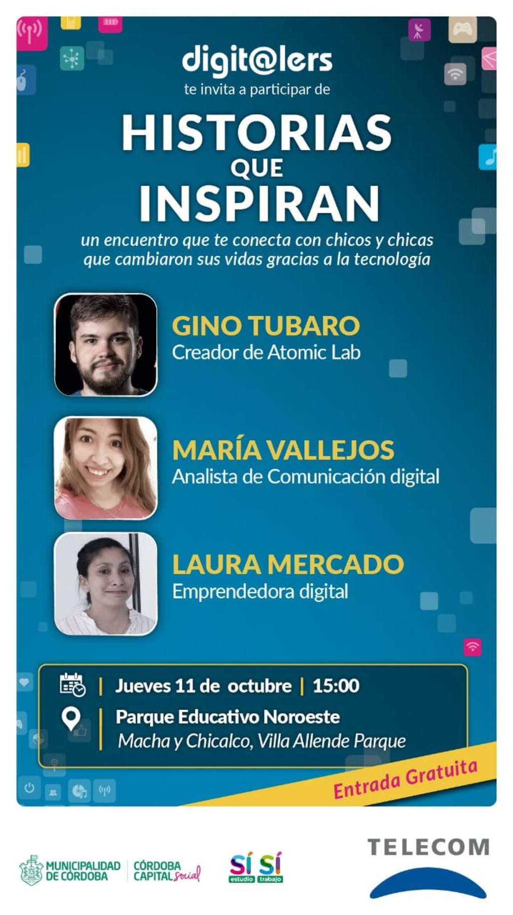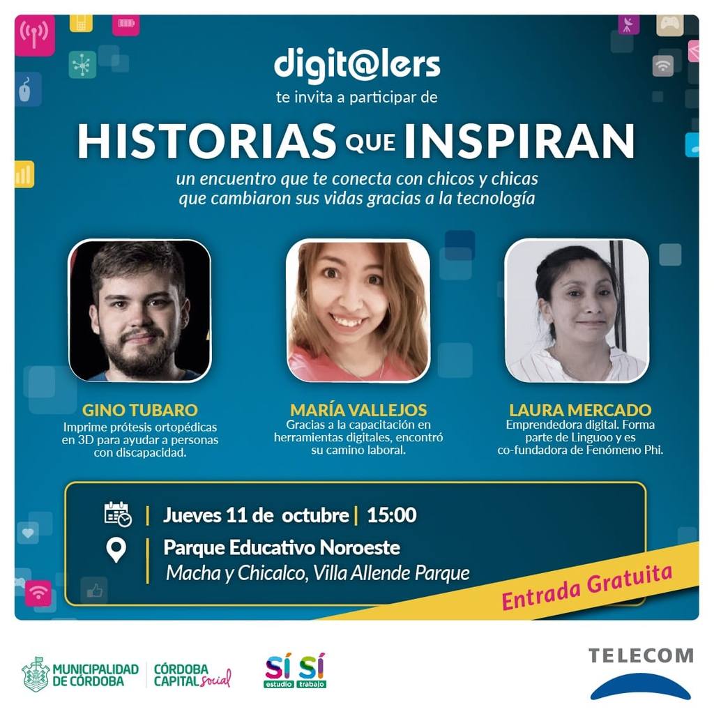 El encuentro será el próximo 11 de octubre a las 15 horas en el Parque Educativo Noroeste (Macha y Chicalco, Villa Allende Parque) y presentará las historias de tres jóvenes que, motivados por la tecnología, se animaron a crear su propio proyecto, cambiar su destino y convertirse en referentes del ámbito digital. Gino Tubaro, María