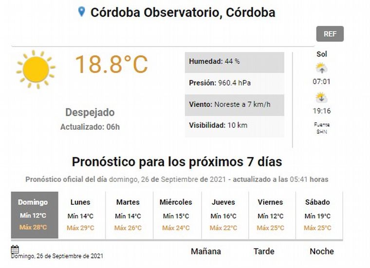 El Observatorio de Córdoba pronosticó una jornada de tiempo seco con cielo despejado para este domingo y una máxima de 28°.