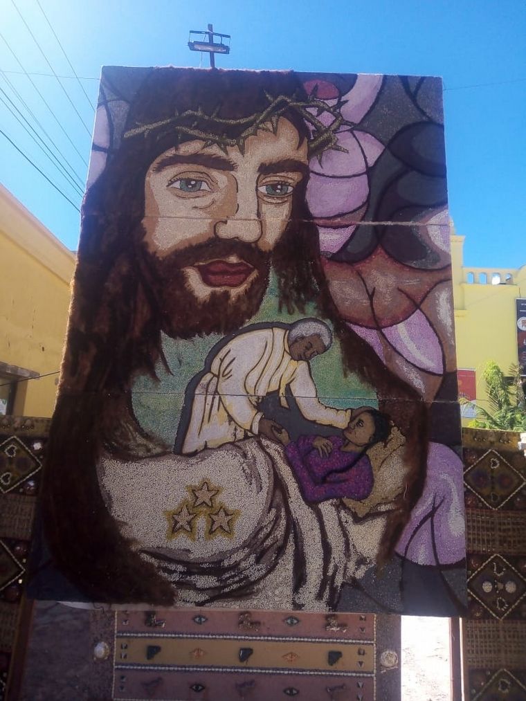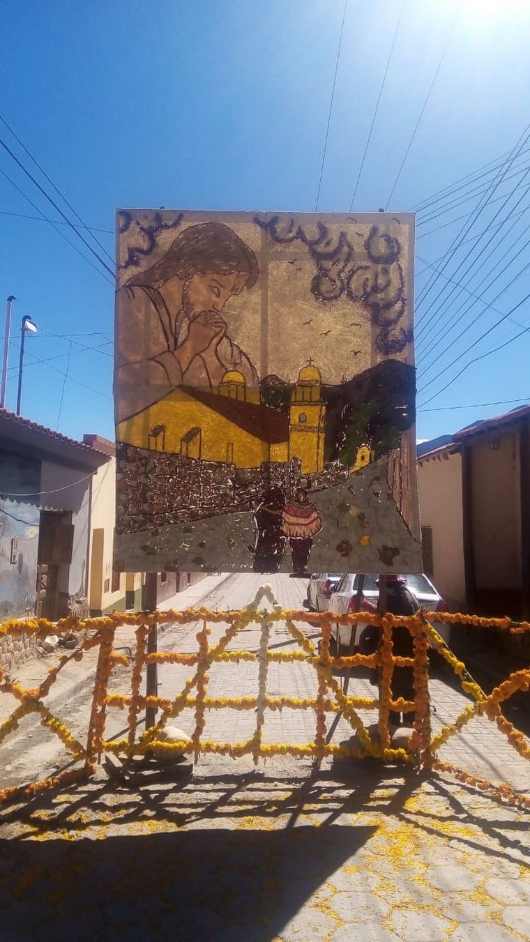 Se trata de cuadros gigantes pintados con tierra, flores y otros elementos naturales como semillas y frutos del lugar, que miden más de 8 metros de altura por 4 de ancho. En total son 14, distribuidas alrededor del pueblo para realizar el Vía Crucis.