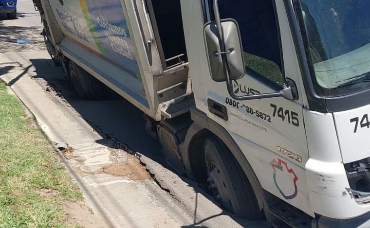 Un camión de residuos cayó en un socavón en barrio Santa Isabel