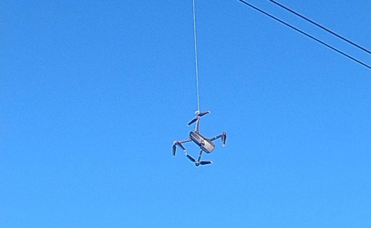 ?? Insólito: próximo a la cárcel de Bouwer se observó un drone con dos celulares atascado en el tendido eléctrico.