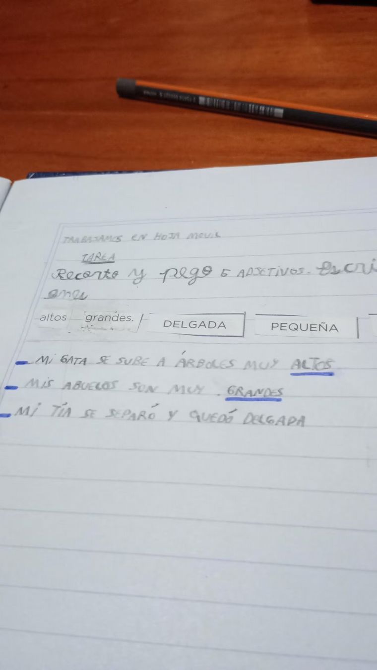 La tarea que desató las risas en internet. La imagen muestra la tarea del niño, quien debía formar oraciones utilizando adjetivos como "altos", "grandes", "delgada" y "pequeña". Una de las frases escritas por el niño llamó especialmente la atención: "Mi tía se separó y quedó delgada".