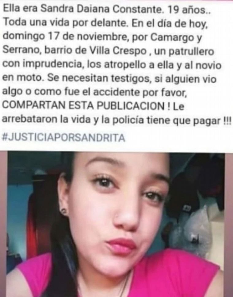 "Los chicos llevaban los cascos puestos; el de Sandra salió disparado por el golpe que le pega el patrullero. Nos llama la atención la velocidad a la que iban, porque no estaban acudiendo a una emergencia, no había apuro por el cual tuvieran que pasar un semáforo en rojo", señaló uno de los manifestantes.