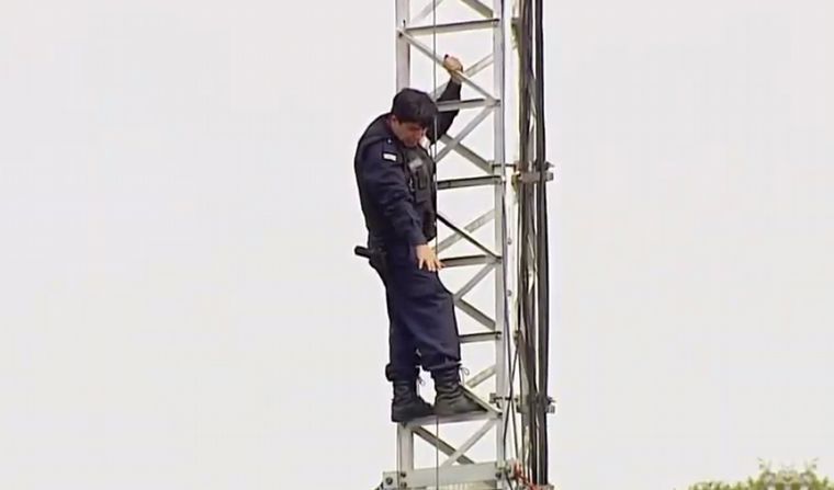 Luego de más de dos horas de estar trepado a la antena, un compañero del policía logró convencerlo de que lo deje subir y con un arnés lo sujetó a la antena para protegerlo de una posible caída.