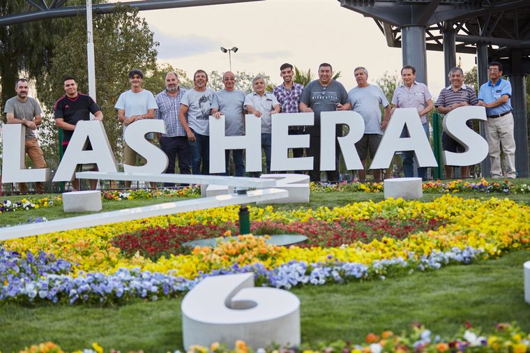 Diseñado por ingenieros agrónomos y topógrafos de la empresa Full Garden, el elemento muestra tres corazones superpuestos en la trama de colores rojo, azul y amarillo. Tiene una circunferencia externa multicolor, además de la tipografía de Las Heras, en color blanco. Lleva 4.500 plantines de pensamientos y 250 metros cuadrados de champas de césped, flores y plantas que serán cambiadas en cada estación.